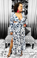 The Black & White Dress is a long sleeve maxi dress with a plunging neckline, slit, and metal ring detail. It is made from stretchy jersey fabric and has a self tie and zipper closure. You can wear this dress for any occasion!